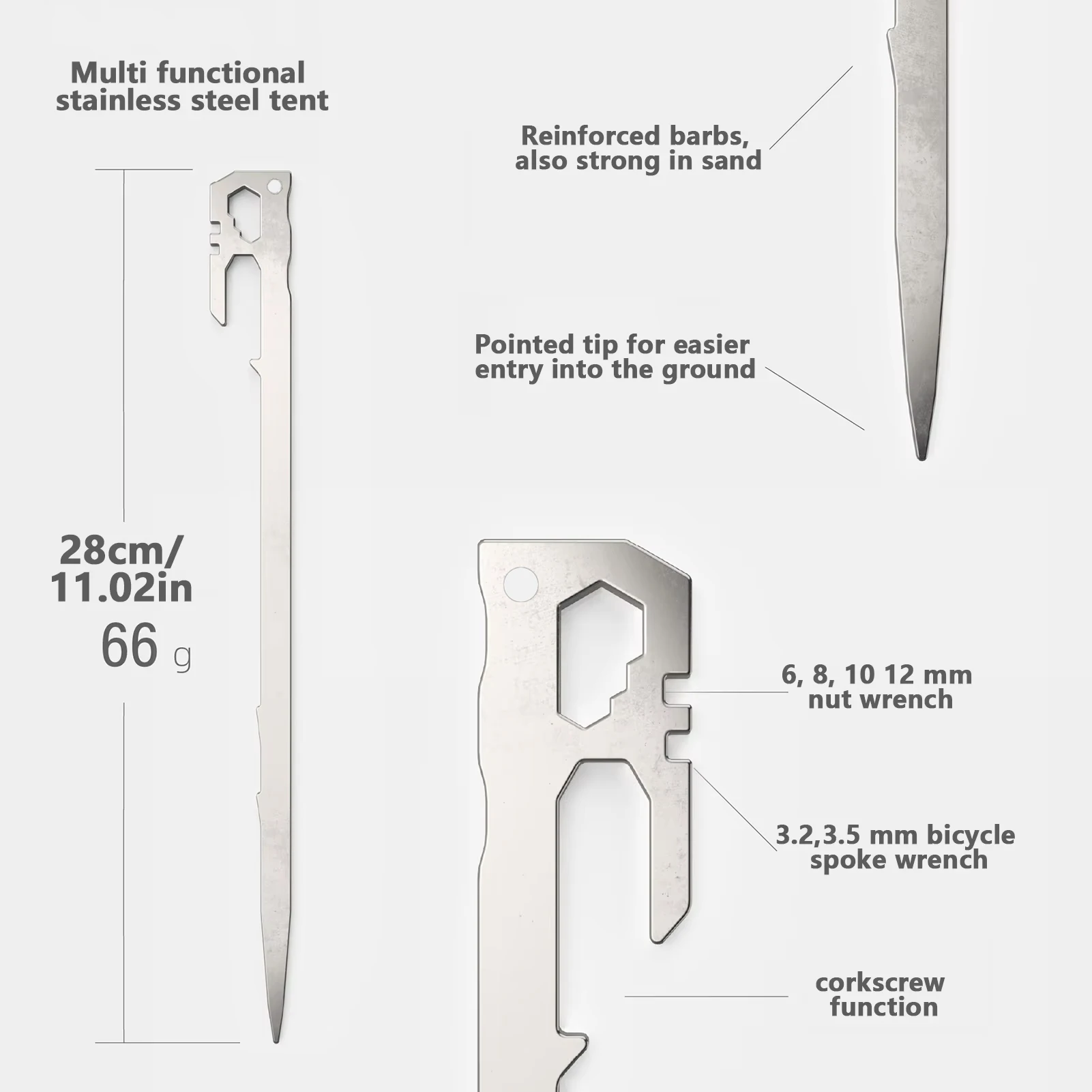 1,Selected Material: Camping Tent Stake has great quality with selected stainless steel material. Ground Tent Securing Peg is sturdy, corrosion-resistant, and not easy to deform.